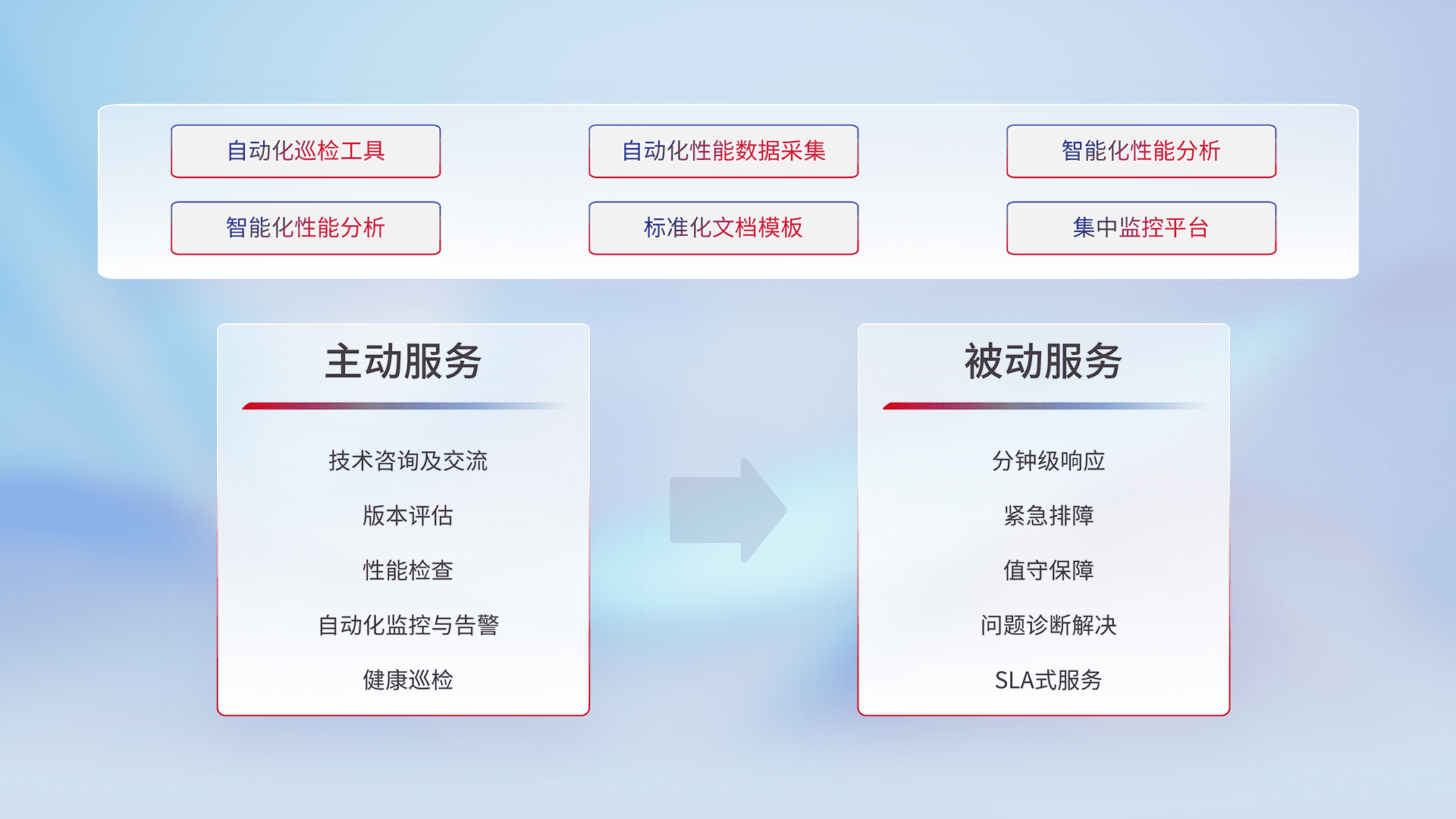 智能化工具和标准化文档,,,,保障服务质量,,,提供主动服务(包含技术咨询、、版本评估、、、性能检查、、自动化监控与告警、、、、健康巡检)和被动服务包含(分钟级响应、、、、紧急排障、、值守保障、、、、问题诊断解决、、SLA服务)。。。。