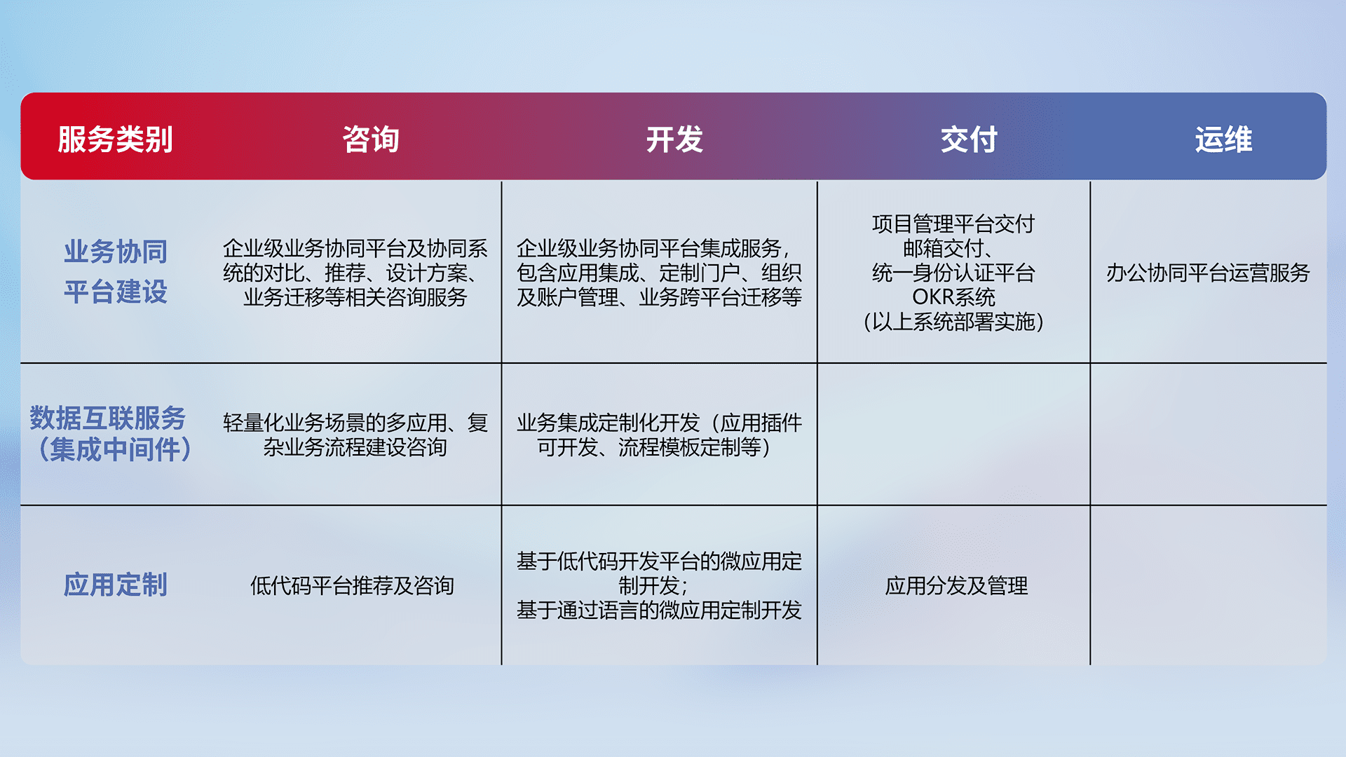 针对钉钉、、企微、、、、IDaas等平台级产品提供产品的规划、、、、方案、、、、交付、、、、定制化开发等服务,,,实现如统一协同办公、、、智能客户服务、、混合会议管理、、智能数据查询、、等业务场景,,,,实现数字化转型。。
